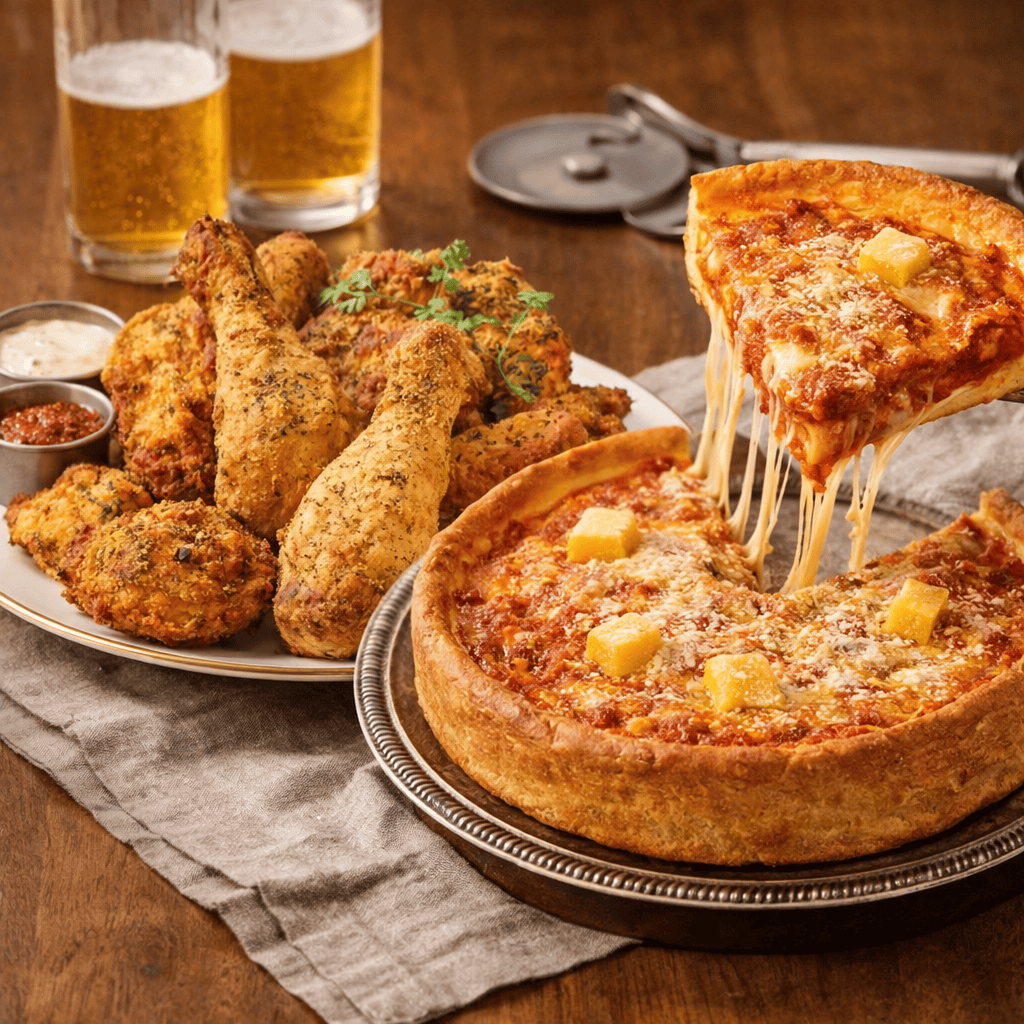 想把桌面再铺得更满一点,贡乃烤鸡的芝加哥深层披萨也很适合。五种优质芝士把奶香堆得很足,切开就有那种“很值”的满足感;阿拉比亚塔风味带一点微辣,把芝士的浓郁衬得更立体。厚厚的深盘饼底外脆内软,吃起来扎实有分量。人多的时候直接点成套餐,一份烤鸡一份披萨,基本就能把聚会的主菜盘稳稳撑住。AI/图