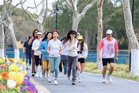 热身完毕,伴随着春日暖阳,达人团正式开跑。本次跑步路线精心选取世纪公园休闲绿道,跑友们穿梭在烂漫花林间,一边享受晨起慢跑的惬意与春日阳光的温柔,一边驻足捕捉奔跑中的灵动瞬间,将运动的活力与春日的惬意完美融合。